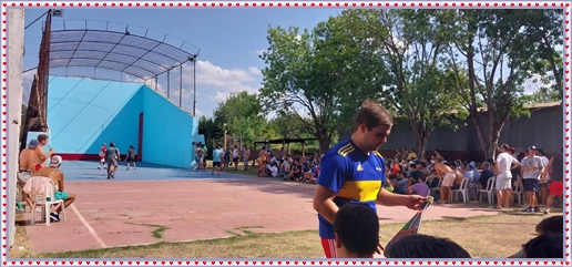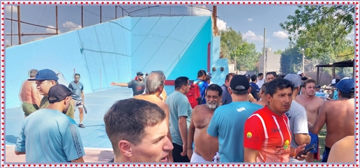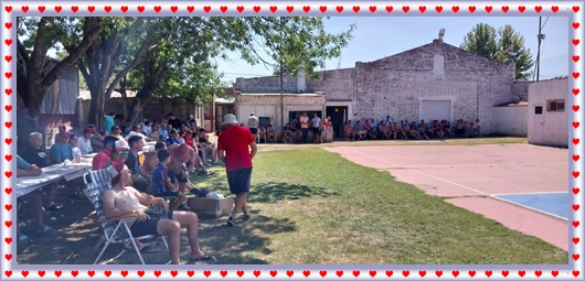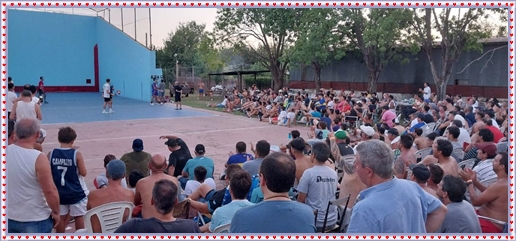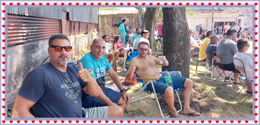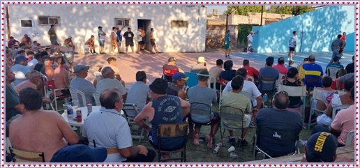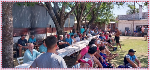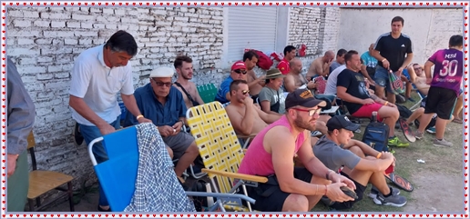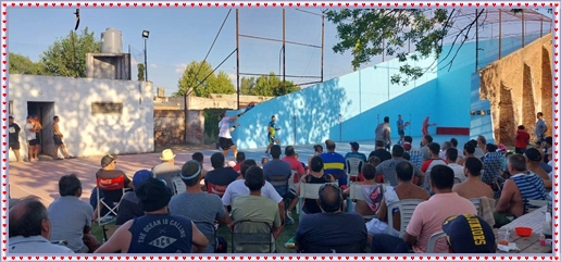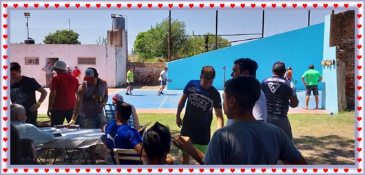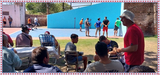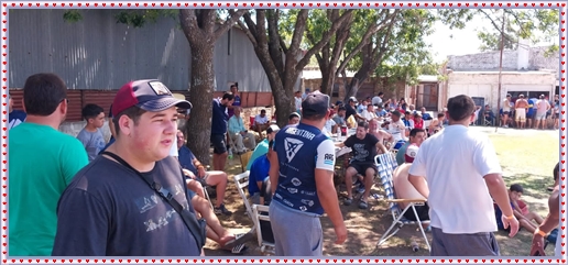 ..De temprano, los primeros calzados asomaron en el piso de DEFENSORES DE RAWSON,..En un rincòn se encendia las primeras tablas para el “ASADAZO POPULAR”,..La mesa era larga, todo estaba previsto, se iniciò con los acostumbrados *DESAFIOS ZONALES*, que hicieron el folclore del deleite entre los presentes, poseyendo pechugones de cuantìa y bien formados, daba gusto observarlos, pendientes al juego, bulliciosos, jocosos, chanceadores, alegres y festivos, esa es mi gente de la del FRONTÒN ARGENTINO.
