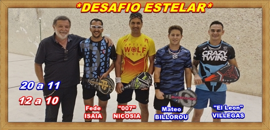 …Todavía resuena en el ambiente deportivo del COLOSO, la exitosa realización que tuvo el carácter de internacional, debido a que en el “DESAFIO ESTELAR”, se enfrentaban 4 anòmalos mundialistas,...Todos ellos CAMPEONES DEL MUNDO, por la presencia estelar del jugador del momento MUNDIAL de FRONTON,..”El Leòn Puly Alfredo VILLEGAS”, puntano de origen total, quien jerarquizó la prueba brindando una demostración de un atletismo de alto nivel junto a su compañero mundialista sub 22, Mateo BILLOROU, de la localidad bonaerense de GUAMINI.