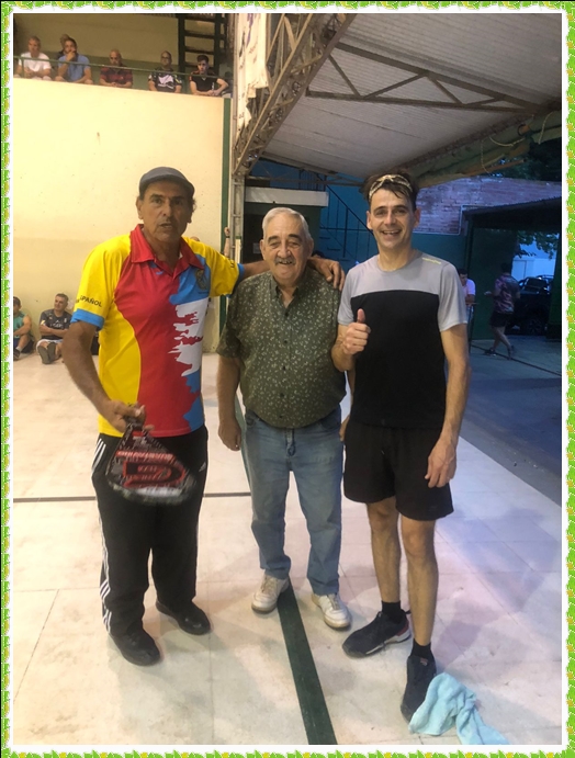 …Un muy buen pechugòn, tambièn de amplia paridad pelotari, con un buen espacio de triufo parta el binomio MARTIN – RAMIREZ,..Pero sorpresivamente, pareciere que SUELDO recordara sus dìas de esplendor,...No tropezaba, ahora poseìa patines , era pulpo,...Las carambolas de impulso de zurda glorificaban su binomio,...Antes de la recta final dieron alcance en el tanteador,...ALLEGRI fue muro de frontòn,..Reventando el griterìo y aplausos en el reducto “verde” del Newbery,..Quedàndose con el triunfo en un score de alargue por un 24 a 20,..A favor de SUELDO – ALLEGRI.