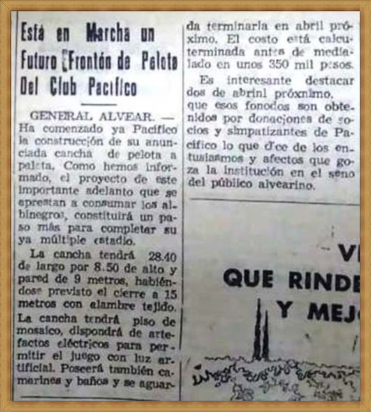 ....Posiblemente fue la primera cancha de la región pues jugadores de General Alvear viajaban en tren para competir. Recién a comienzo de la década del 60, el club Pacífico inauguró su cancha, tal como lo señala el diario Los Andes de febrero de 1960, aunque desconozco la existencia de otra cancha.
