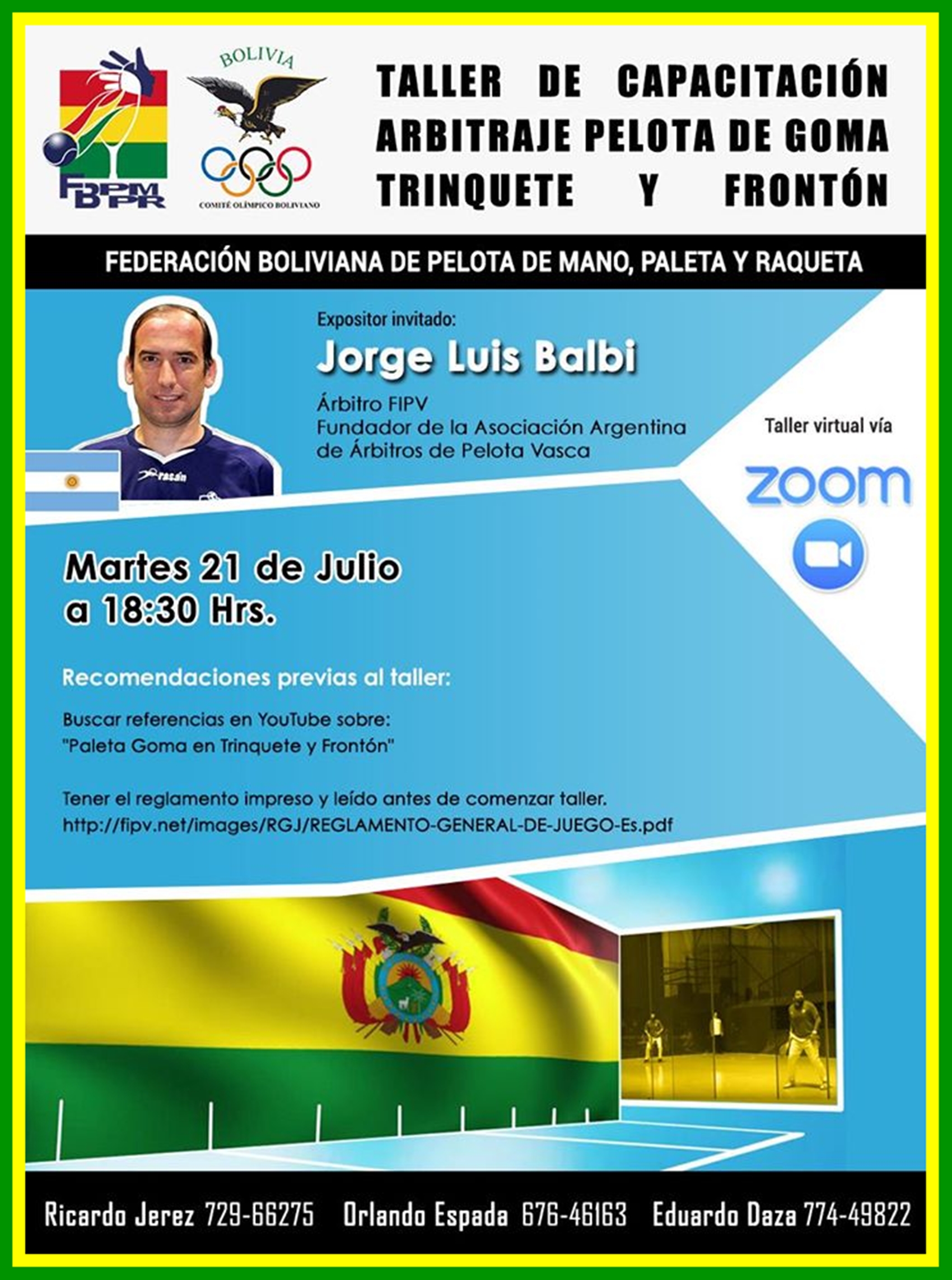 ...Invitamos a toda la comunidad frontonera a participar del Taller de capacitación "Arbitraje pelota de goma trinquete y frontón", que se llevará a cabo el día martes 21 de Julio a las 18:30 Hrs.