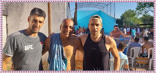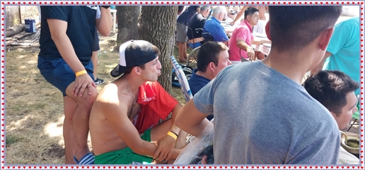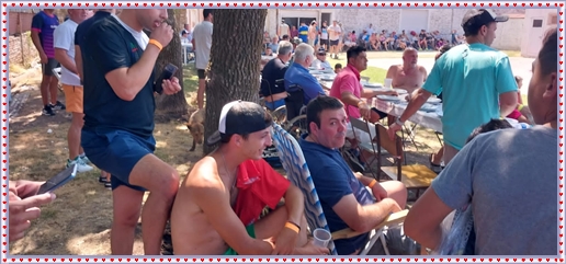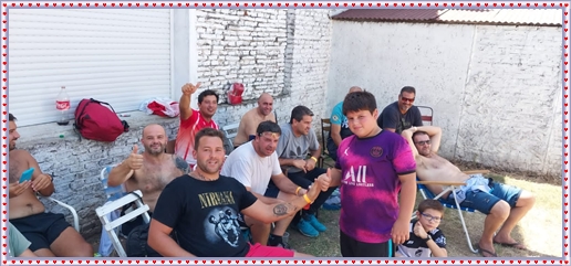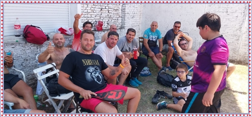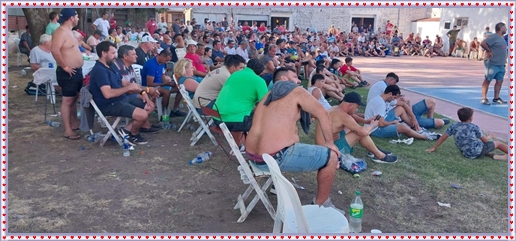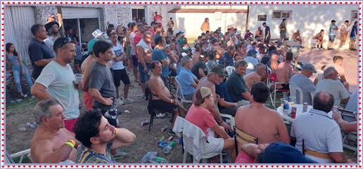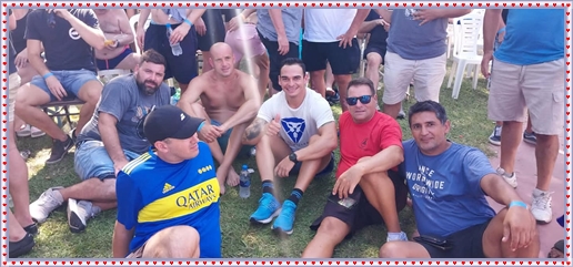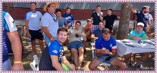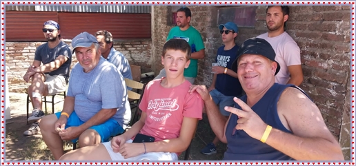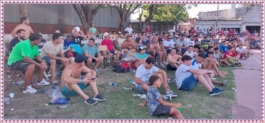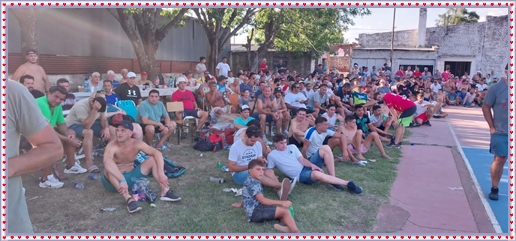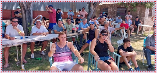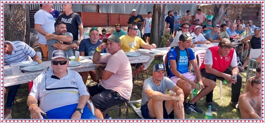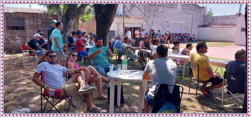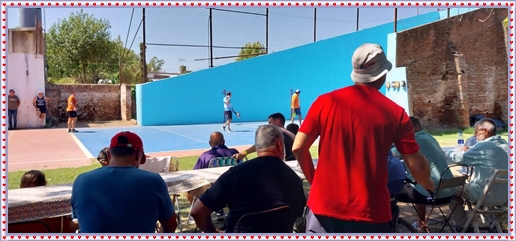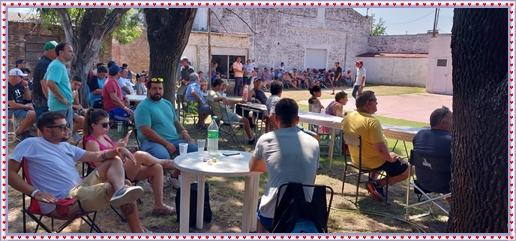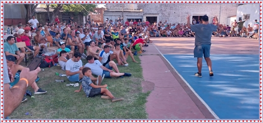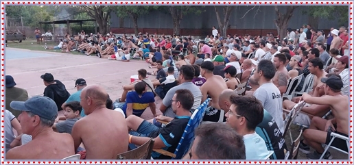 ..De temprano, los primeros calzados asomaron en el piso de DEFENSORES DE RAWSON,..En un rincòn se encendia las primeras tablas para el “ASADAZO POPULAR”,..La mesa era larga, todo estaba previsto, se iniciò con los acostumbrados *DESAFIOS ZONALES*, que hicieron el folclore del deleite entre los presentes, poseyendo pechugones de cuantìa y bien formados, daba gusto observarlos, pendientes al juego, bulliciosos, jocosos, chanceadores, alegres y festivos, esa es mi gente de la del FRONTÒN ARGENTINO.