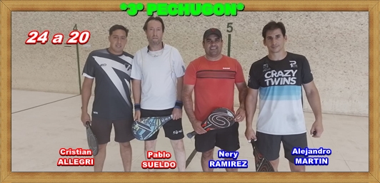 …Un muy buen pechugòn, tambièn de amplia paridad pelotari, con un buen espacio de triufo parta el binomio MARTIN – RAMIREZ,..Pero sorpresivamente, pareciere que SUELDO recordara sus dìas de esplendor,...No tropezaba, ahora poseìa patines , era pulpo,...Las carambolas de impulso de zurda glorificaban su binomio,...Antes de la recta final dieron alcance en el tanteador,...ALLEGRI fue muro de frontòn,..Reventando el griterìo y aplausos en el reducto “verde” del Newbery,..Quedàndose con el triunfo en un score de alargue por un 24 a 20,..A favor de SUELDO – ALLEGRI.