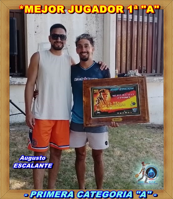 …Agusto Escalante, un auténtico guerrero Masai, con su piel morena musculosa, alto, espigado y ágil. Su origen local de Villa del Chocon y su polifuncionalidad como pelotari, basquebolista, trotamundos y defensor en Pelota a Paleta lo convierten en un personaje fascinante, su técnica y visión de juego, hace que sea fácil imaginarlo en acción, con "la negrita" en pala, defendiendo con reciedad y metiendo con precisión. No es de extrañar que haya sido electo como "El Mejor Jugador" de Segunda Categoría Special por la C.D. del "Rey de la Colina".