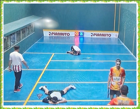 …No se amilanaron, y son jugadores d elite nacional,...No son “moco e´pavo”,…De pronto vuelve el alma al cuerpo puntano, cuando el juvenil Andrés Villegas clava una reja dos paredes enfrente de la nariz de Darío CEDREZ, …Último saque, llego el acabose,...Estábamos 6 a 6, silencio total, no volaba mosca, solo faltaba decir “el que se mata es”,…..Impulsa el ultimo saque Andrés VILLEGAS, SE PRODUCE UNA GUERRA DE REVENTAR BELLOTAS, nadie se guarda nada, de pronto “EL PROFE” de la Escuelita de Pelota C.E.C., impulsa una bola elevada con fuerza por izquierda, hhhummmmm,..Pasó rozando la reja del fondo, al grito de Andrés,…Vamos “Puly” que llegas, es tuya, la pelota no se mata, da un recorte y se arrastra,…Los “guerreros” santafecinos caen desparramados en el suelo, terminaron cobrándose el pechugón final, CAMPEONES INVICTOS ganando en el tercer set por 7/6 a los puntanos, quedándose con un título que hacía 44 años se le negaba a la provincia de Santa Fe.