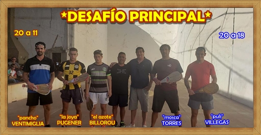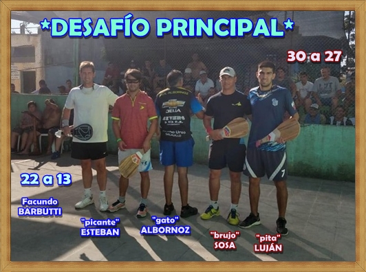 ...Este “DESAFÍO” fue… “una declaración de amor a una pelota “negrita””. La definición es de su autor, que de seguro afirmarán, que en su vida de trabajo, solo ha hecho dos cosas: juntar amigos, y jugar Pelota Paleta. Y ahora este fue ‘Un partido de leyendas’, jugado con un cariño que se percibe en cada uno de sus golpes, primorosamente diseñados por cada uno de ellos mismos.